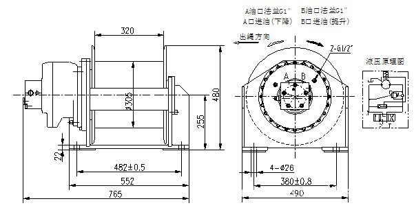 3.5T(SYJ3-35-92-16-ZP)液壓絞車主要由配流器(由帶單向平衡閥及控制制動(dòng)器的高壓梭閥等閥組組成)、SNM2-600型液壓馬達(dá)、制動(dòng)器、行星減速機(jī)、卷筒、機(jī)架、離合器等部件組成。